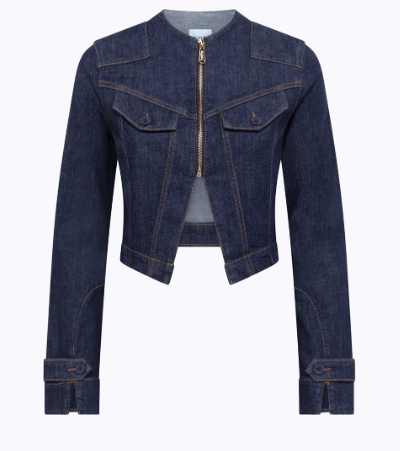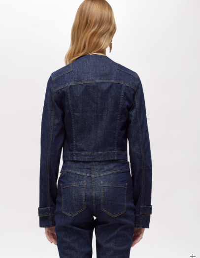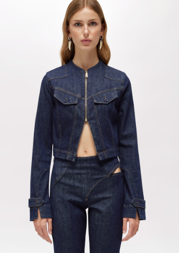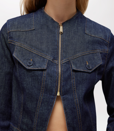 NUOVA LETTURA DELLA DENIM JACKET IN CHIAVE BLUGIRL. HA COLLO ALLA COREANA, CHIUSURA CON ZIP IN METALLO, SPACCO AL FONDO, MANICHE LUNGHE CON SPACCHETTI AI POLSI E ALAMARI, IMPUNTURE COLOR TABACCO, LAVAGGIO RINSE. LA ROSA ALL’OCCHIELLO AGGIUNGE UN TOCCO ICONICO.