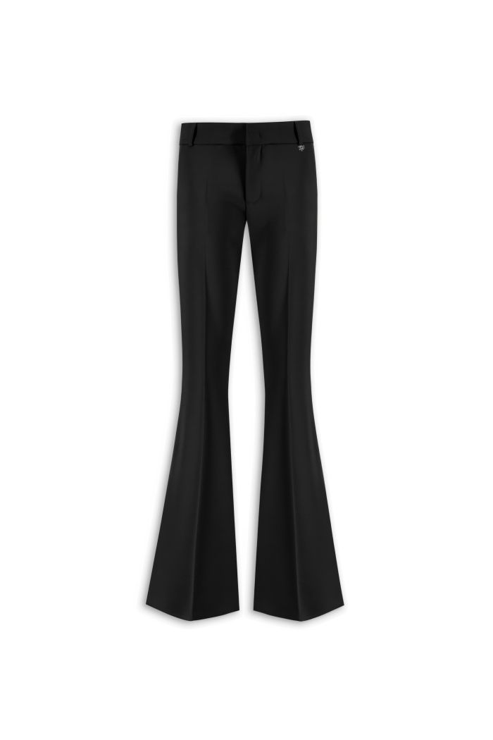 PANTALONE LUNGO CON GAMBA STRETTA CHE SI ALLARGA SUL FONDO FINO A DIVENTARE UN CAPO A ZAMPA, REALIZZATO IN TESSUTO TECNICO. MODELLO A VITA MEDIA CON FASCIONE DOTATO DI PASSANTI, A CUI ร APPESO CIONDOLO AB. CHIUSURA FRONTALE CON CERNIERA, BOTTONE E GANCETTO.